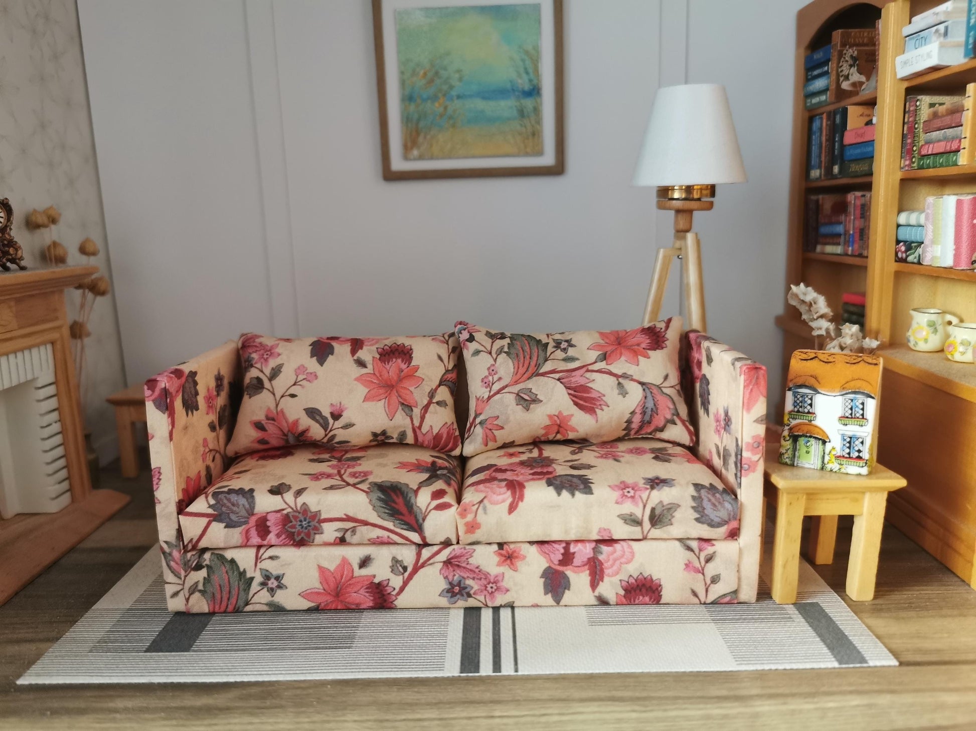 Dolls House 2 Seater Sofa in Stone, Pink and Green Floral Print | 1:12th Scale | Handmade